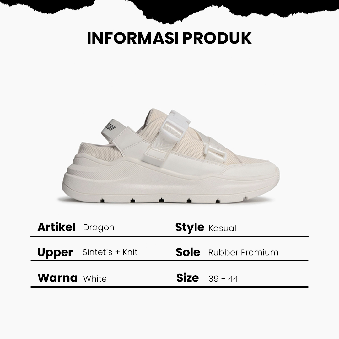 Art : Dragon (man) Color : White Size : 39 - 44 Harga : 399.000 Upper : Vegan Premium Leather + Premium Knit/Mesh + High Quality Webing material Sole : Thermoplastic Rubber Premium Insole : Johnson Comfort Foam Size Chart : 39 - 24.5 cm 40 - 25 cm 41 - 26 cm 42 - 27 cm 43 - 28 cm 44 - 29 cm