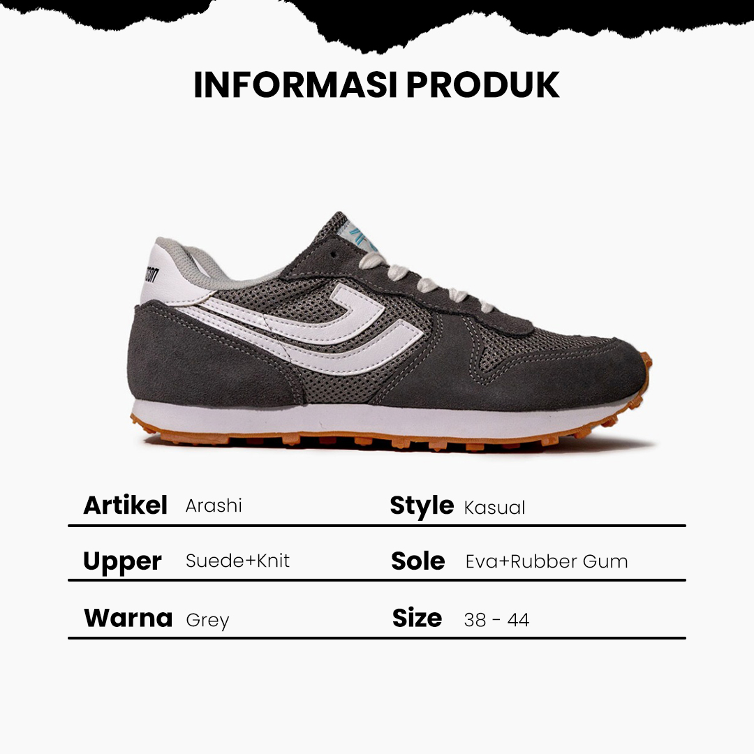Art : ARASHI Color : Grey Size : 38 - 44 Upper : suede + premium knit Insole : Ortholite Outsole : Eva + Gum Rubber Lining : Busa Lapis Jersey SIZE CHART ARASHI ARASHI 38 : 23CM 39 : 24 CM 40 : 25 CM 41 : 26 CM 42 : 27 CM 43 : 28 CM 44 : 29 CM
